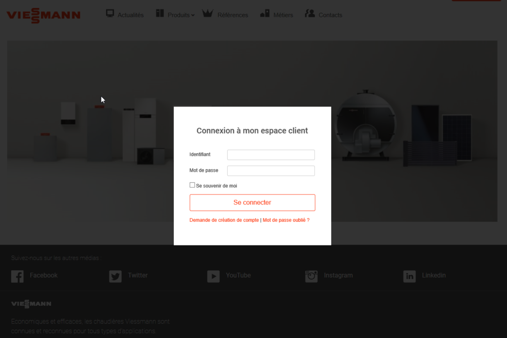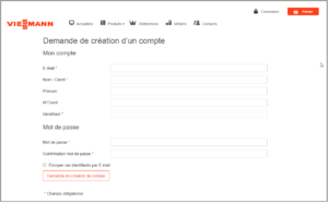 Afin de faciliter la demande de création de compte, un formulaire Demande de création de compte a été ajouté au menu Connexion. Une fois la fenêtre de connexion affichée, vous aurez accès à un lien Demande de création de compte. Vous pourrez ainsi renseigner vos informations personelles, votre n° de compte client Viessmann et mot de passe. Cliquez sur le bouton afin d’envoyer votre demande à solutionsdeprescription@viessmann-france.com. Vous recevrez un premier mail vous confirmant la bonne création du compte puis un second lorsque l’accès définitif aura été validé par l’administateur du site.