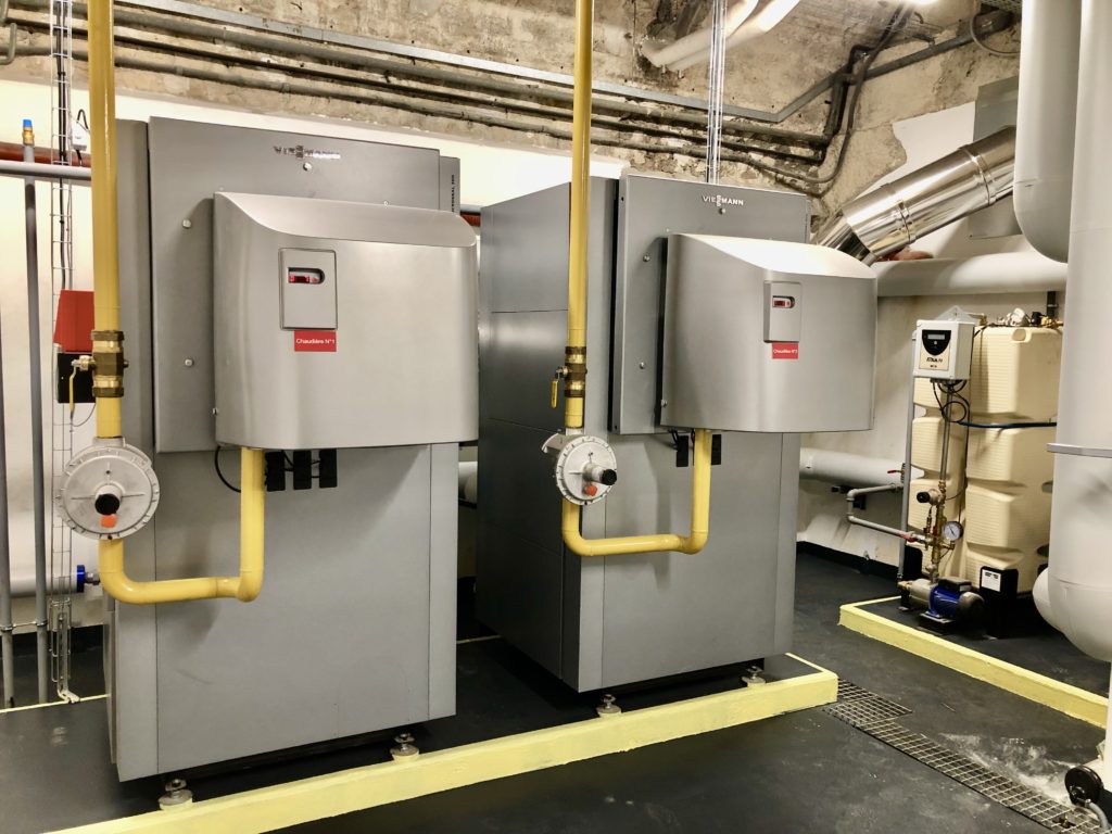 La chaufferie Sainte Geneviève était équipée auparavant de 3 chaudières dépassant le MW. La distribution des réseaux se faisait à partir d’une bouteille de mélange. Surtout , Il y avait 27 m de conduit fumée non linéaire. L’étude consistait de passer sous le MW (réglementation ICPE 2910), tout en trouvant des chaudières condensantes capables de pousser les fumées sur cette longueur de conduit. Chauffage Ramonage Service, par sa connaissance de nos chaudières, nous a proposé en plus une simplification hydraulique (suppression bouteille) de la chaufferie.